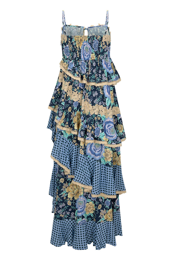 The Full Bloom Ruffle Soirée Dress in Periwinkle is pure enchantment. With a romantic allover print, this dreamy silhouette features a delicate keyhole with a tie closure, finished with tassel trim for a touch of bohemian charm. Intricate custom lace detailing graces the neckline and skirt, while a shirred back bodice panel ensures a flattering fit. Adjustable straps and a side zipper offer ease of wear, while the asymmetrical ruffled hem adds movement and drama. Perfect for golden hour moments, we can't wait to see you twirl in this one!