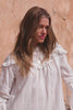 The Whimsy Garden Lace Tunic Dress in Moonflower is a vision of romantic elegance and bohemian charm. Crafted from 100% Organic Cotton, this dress features a beautiful textured dobby weave that gives it a unique, vintage feel. The Schiffli lace yardage at the yoke and hem, along with pintucks and lace trims, infuses the dress with intricate detail, while the bell sleeves add a touch of whimsical flair. The back neck split, complete with a button & loop fastening, offers a delicate hint of skin. Finished with a crochet flower and tassel tie, and a flattering self waist tie, this dress embraces effortless, feminine style. The separate slip lining ensures comfort, while side slits add fluid movement. Perfect for daytime outings or evening adventures, this tunic dress pairs beautifully with your favorite sandals or boots.